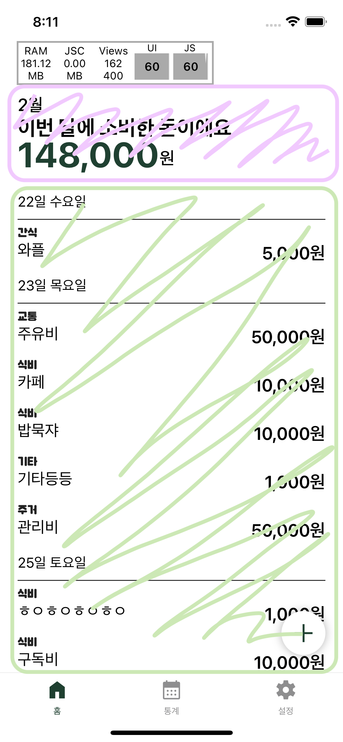 잠시 useDate라는 CustomHook에 대해 설명을 드리려고 합니다. 서버까지 만들어 관리하면 운영비와 서버 설계까지 해야 하는 것은 너무 과하다고 판단했고 Severless 구성으로 만들기 위해 해당 앱의 서버는 Firebase로 구성되어 있습니다. DB는 Realtime Datebase로 No SQL을 사용하고 있습니다. 내가 원하는 날짜의 데이터 값을 DB에 요청해 받아오면 Total과 List에서 사용할 수 있게끔 데이터를 정리하는 로직과 데이터는 날짜를 조건으로 전달해주기 때문에 날짜 값과 날짜를 수정할 수 있는 값 또한 가지고 있습니다. 아래와 같이 값을 리턴해줍니다. (total은 분리해서 Total Component에 넣어도 될 것 같네요.)