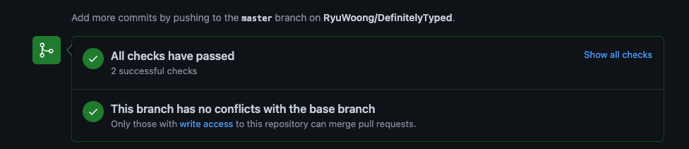 Pull Request를 요청하면, Bot이 진행사항을 알려주고 conflict 되는 등의 문제가 발생하지 않는다면, 아래처럼 깔끔하게 통과가 됩니다.